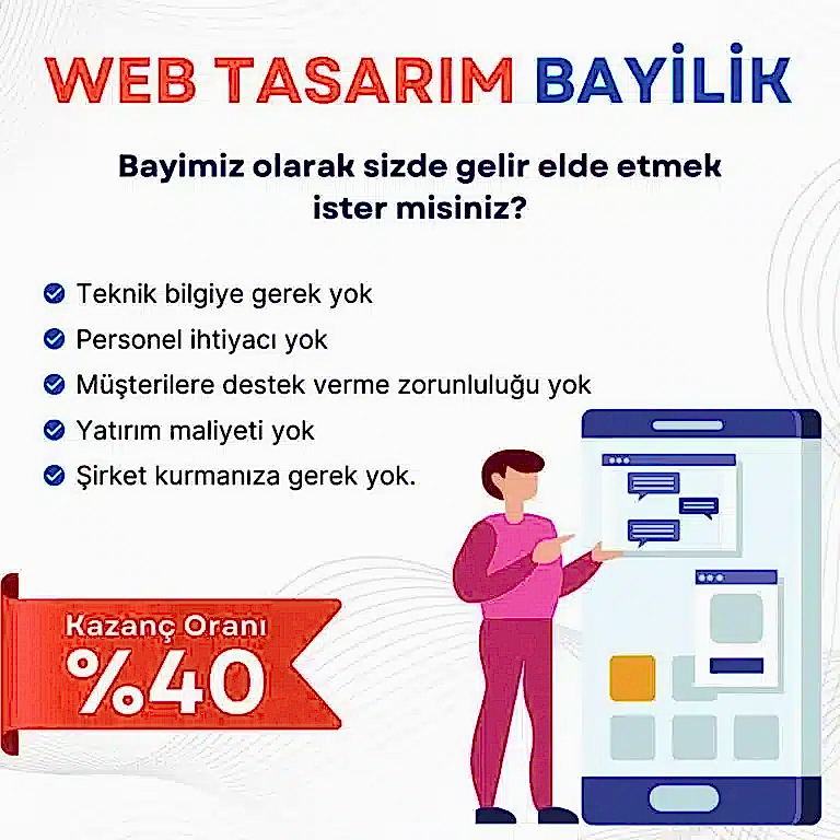 Sizlere özel Bayilik Sistemimiz ile bölgenizdeki ve internet üzerindeki tüm müşterilerinize; Eticaret Web Hizmeti, Kurumsal Web Hizmeti ve Gelişmiş Seo Hizmetleri satabilir, sürekli artan yüksek gelir elde edebilirsiniz.